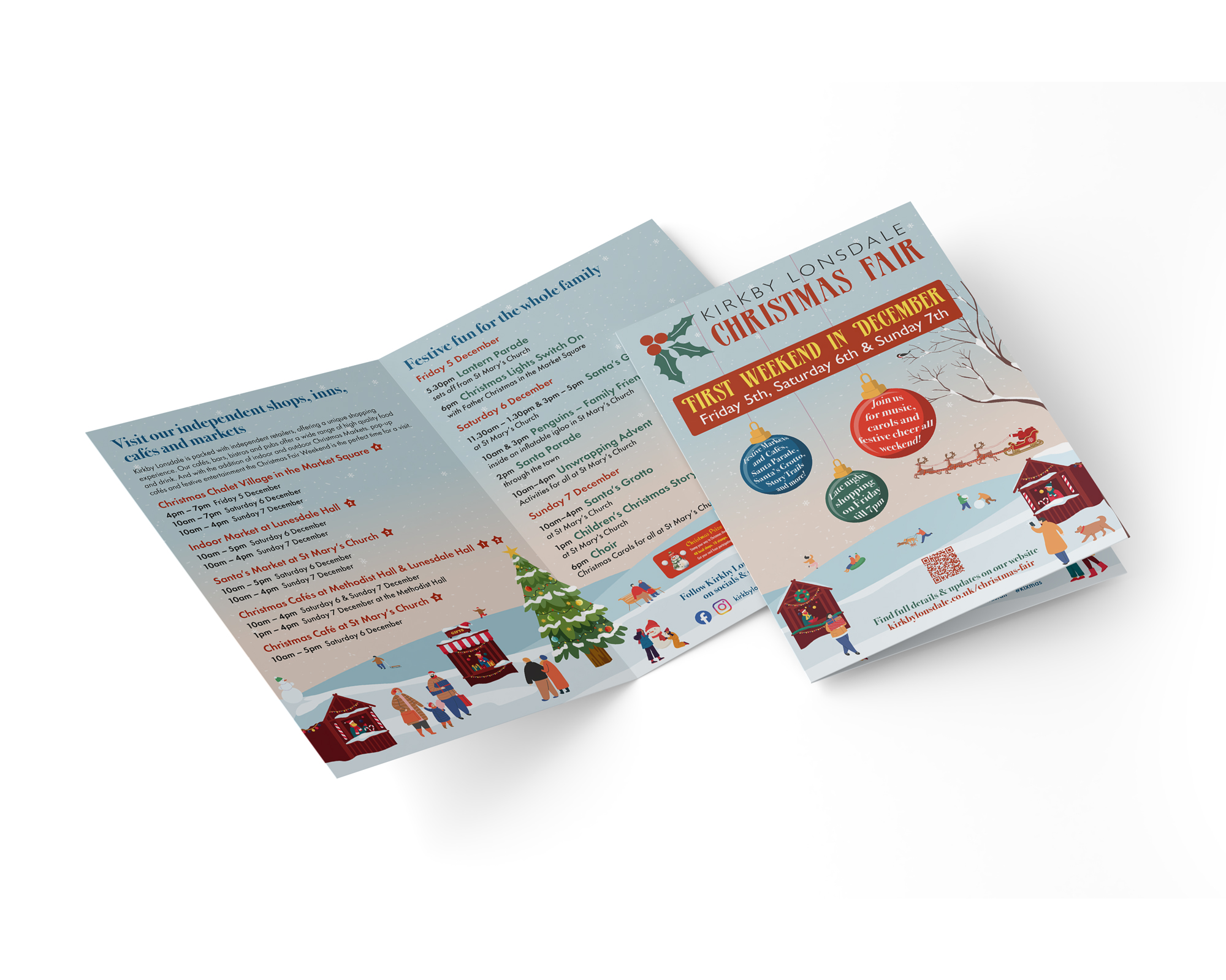 A four page A5 flyer design for Kirkby Lonsdale's 2025 Christmas Fair weekend. Also supplied with this project were adverts and social media graphics.